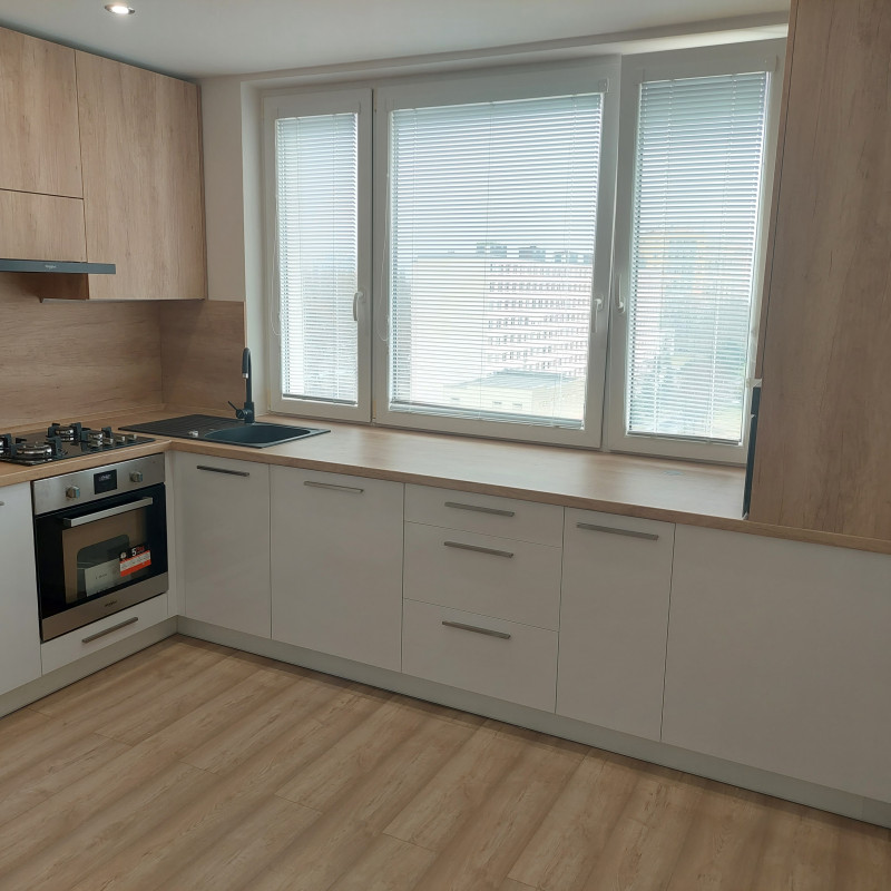 ** nová kuchynská linka na mieru so zabudovanými spotrebičmi (elektrická sklo-keramická varná doska, elektrická rúra na pečenie, digestor, chladnička, mraznička, mikrovlnná rúra) **